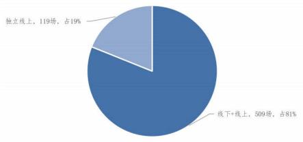 自2020疫情以来,线上展厅,网上办展等话题引起热议,数字线上展也迎来急速发展,中国会展经济研究会统计通过收集各地上报统计数据,收集并整理出 2020 年境内线上展的相关信息如下:2020 年中国境内线上展总计举办 628 场,其中同期举办境内线下展的展览总数达到 509 场,占比达 81.05%,另外 119 场线上展则单独举行,占比达 18.95%。见下图: